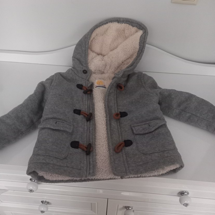 Düğmeli kapamalı, gri renkli, içi yumuşak ve sıcak astarlı, erkek çocuklar için kesimi dar mont. Notch yakalı, günlük sokak tarzı.