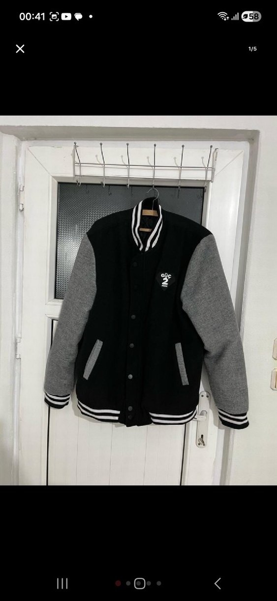 Erkek çocuklar için düğmeli, baskılı ve gri-kara renk kombinasyonlu, rahat ve sıcak kumaştan yapılmış fitted street wear ceket.