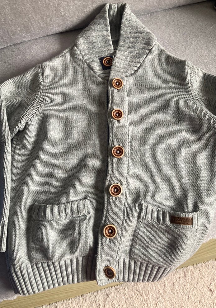 Erkek çocuk için düğmeli, uzun kollu, bol kesim gri renkte yumuşak triko hırka. İki cep ve sokak tarzı tasarımıyla öne çıkar.