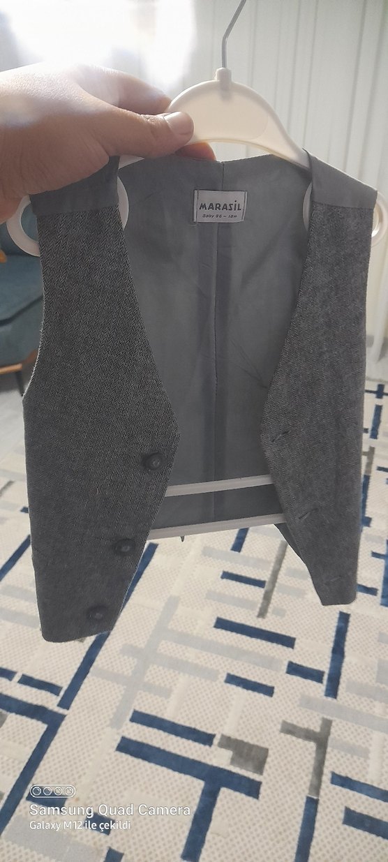 Düğmeli, sivri yaka erkek çocuk yeleği, gri renkte ve yumuşak sentetik kumaştan üretilmiştir. Regular fit ve kolsuzdur, MARASIL markalıdır.