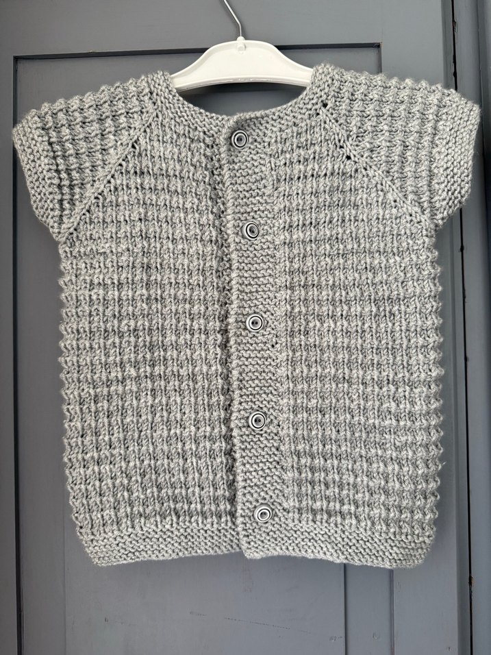 Erkek çocuk için örme kumaştan, bol kesim gri yelek. Bisiklet yaka, kolsuz ve desensiz sade tasarım sunar.
