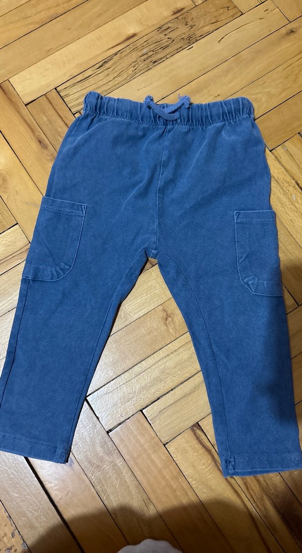 Erkek çocuklar için elastik bel ve rahat kesime sahip, yumuşak denim kumaştan gri-mavi renkte, sade ve sokak tarzı pantolon.