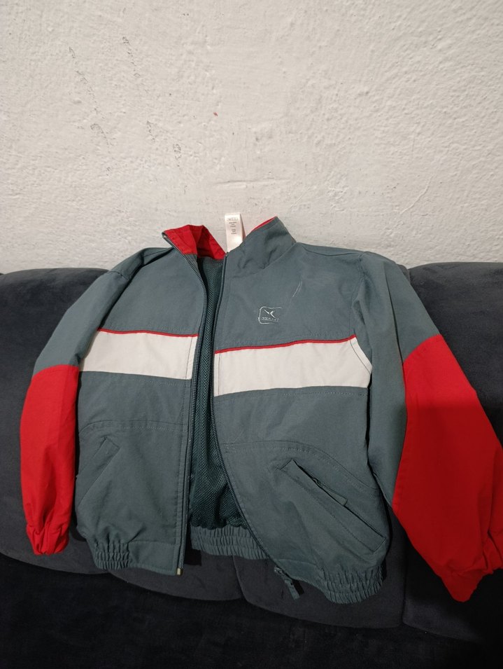 Gri, kırmızı ve beyaz detaylı, yüksek yakalı ve fermuarlı erkek çocuk ceketi, yumuşak ve sıcak kumaştan, fit kesimle tasarlanmıştır.