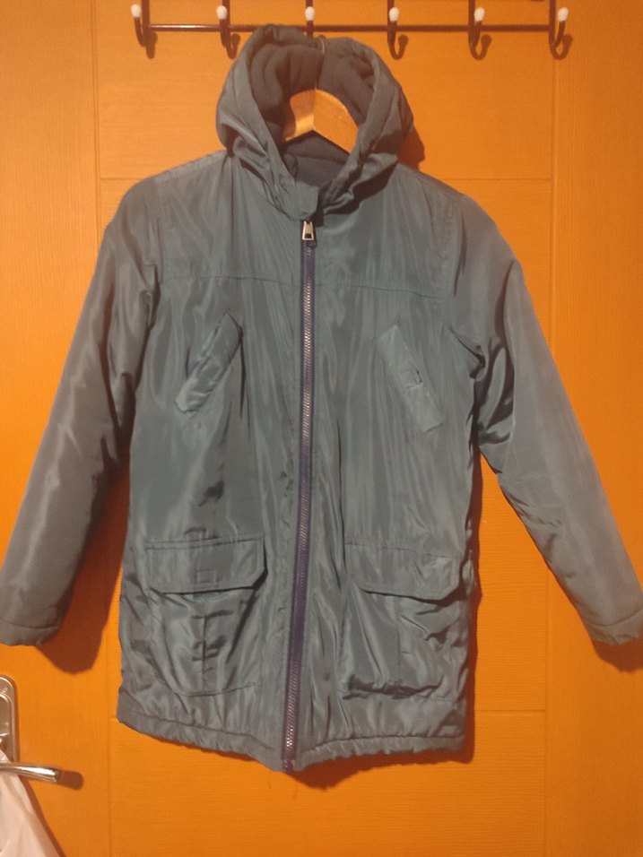 Fermuarlı ve kapüşonlu, yumuşak ve sıcak kumaştan yapılmış gri, dar kesim erkek çocuk montu. Sokak stili ve çoklu cepler içerir.