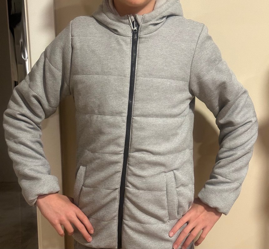 Fermuarlı, kapüşonlu ve cepli erkek çocuk montu. Gri renkte, içi yumuşak polarlı