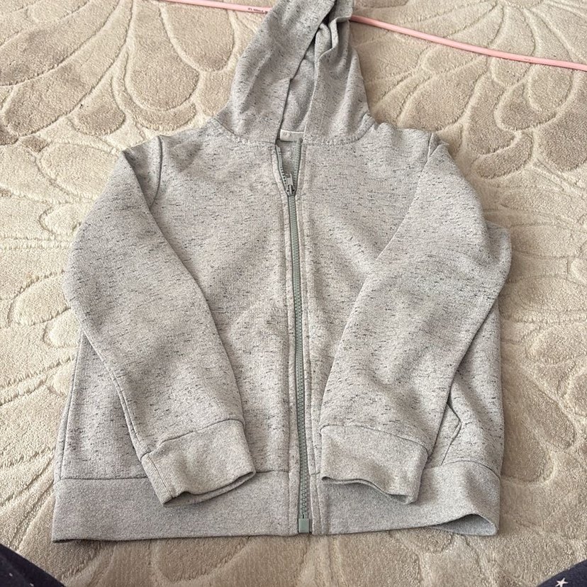 Gri renkli, kapüşonlu ve fermuarlı erkek çocuk sweatshirtü. Yumuşak ve sıcak kumaştan, uzun kollu ve sade tasarımlı, sokak stiline uygun. fermuarında bozukluk var göründüğü yere kadar kapanmakta