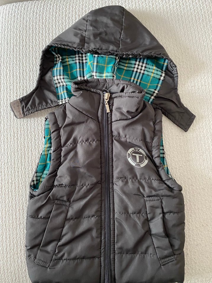 Erkek çocuklar için gri, fermuarlı ve kapüşonlu yelek. Büzgülü kapüşonun içi yeşil ekose desenli, dar kesim ve boğazlı yaka ile sokak modasına uygun.