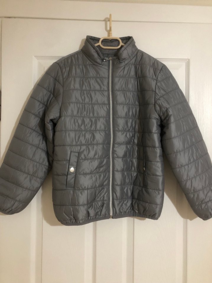 Fermuarlı ve yakası kesik detaylı, gri renkli, yumuşak ve sıcak tutan kumaştan yapılmış, dar kesim erkek çocuk montu.