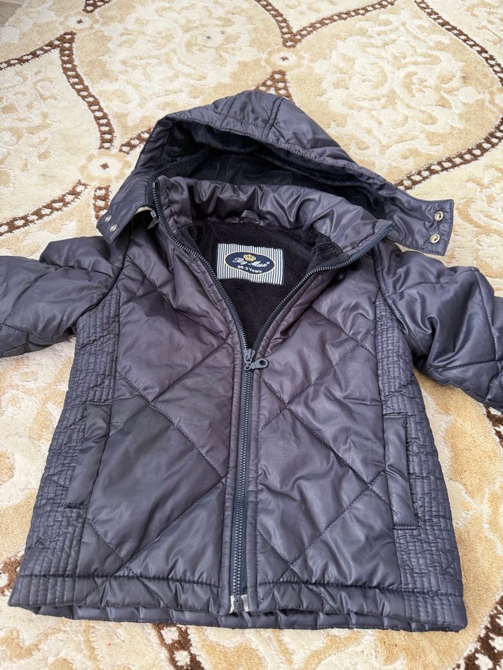 Fermuarlı ve kesimli yakalı, koyu gri renkli erkek çocuk montu. Yumuşak ve sıcak kumaştan, günlük sokak tarzına uygun.
