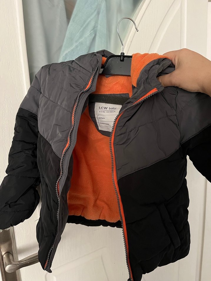 Fermuarlı, notched lapel yakalı, gri-siyah dış yüzeyli, içi turuncu yumuşak ve sıcak astarlı mont. 4 5 yaş uyumlu çok az kullanıldı