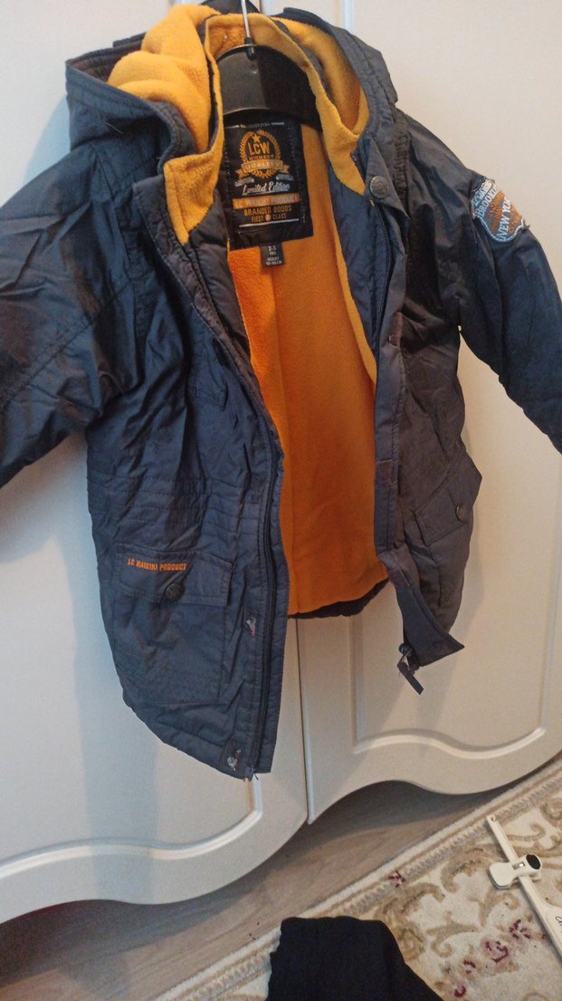Erkek çocuk için fermuarlı, kesimli gri monttur. İç kısmı turuncu yumuşak kumaşla kaplıdır ve sokak tarzına uygundur.