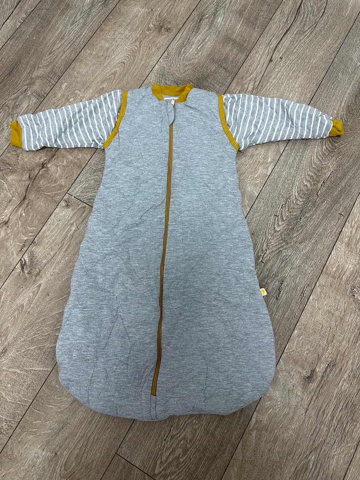 Erkek çocuklar için gri, fermuarlı uyku tulumu. Çizgili uzun kollu ve yuvarlak yakalı, rahat uyku için ideal.