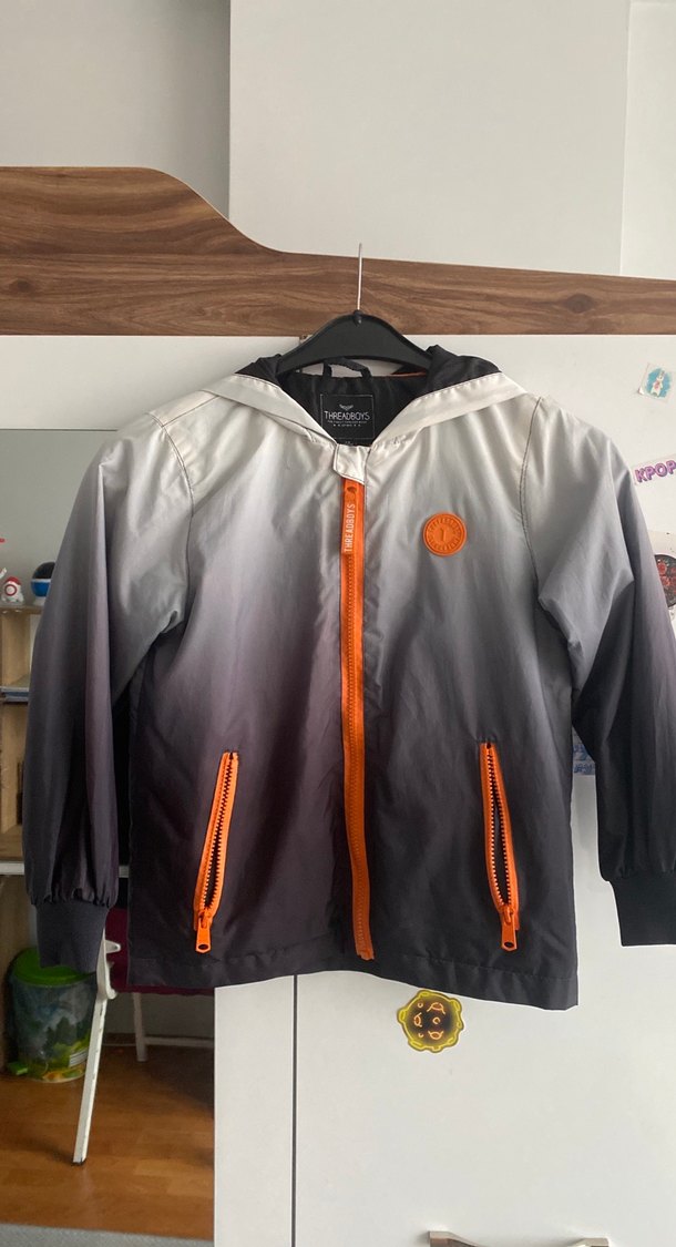 Erkek çocuklar için gevşek kesim, bisiklet yaka ve yumuşak sıcak kumaştan yapılmış gri yağmurluk. Canlı turuncu fermuarlı cepler ve ön kapama bulunur. Sokak stiline uygun.