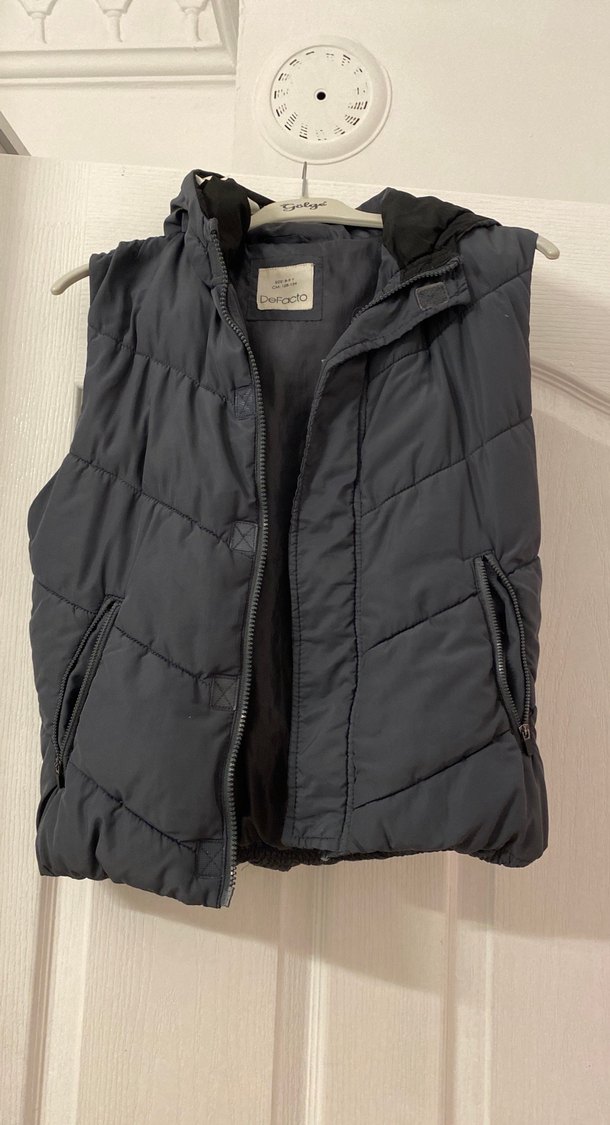 Erkek çocuklar için yüksek yakalı, fermuarlı cepli, gri renkte, yumuşak ve sıcak dokulu, dar kesim yelek.