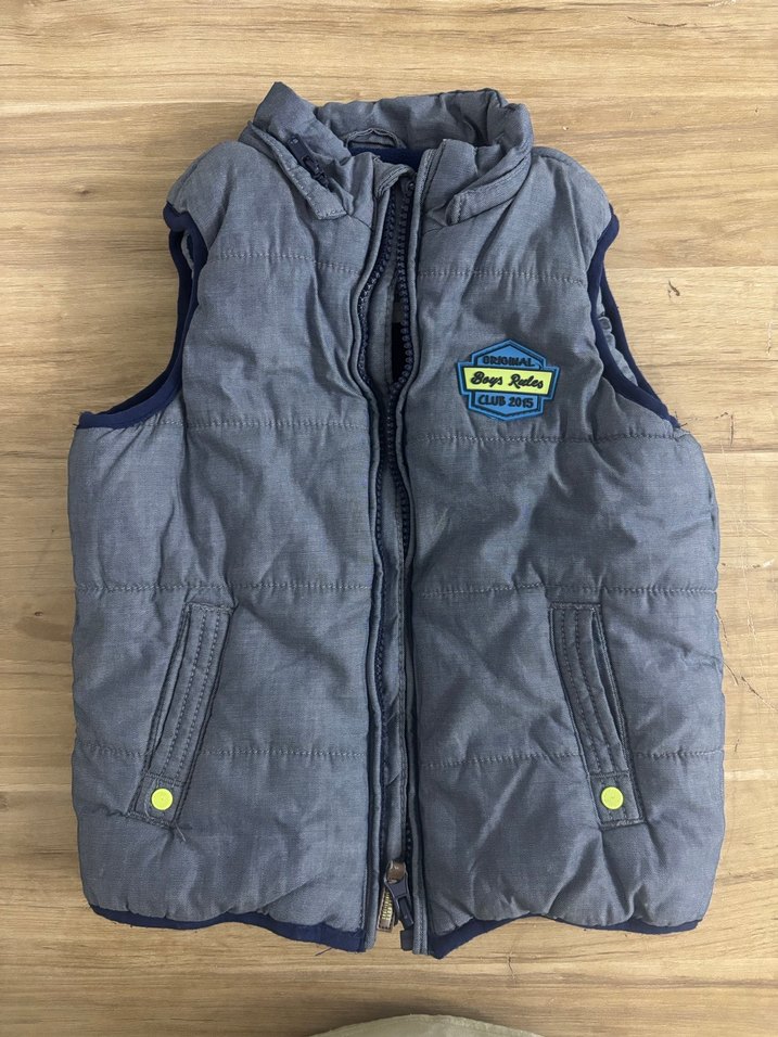 Gri renkte, fermuarlı ve kolsuz erkek çocuk yeleği. Notlu yaka ve iki cep bulunur, yumuşak ve sıcak kumaştan yapılmıştır.