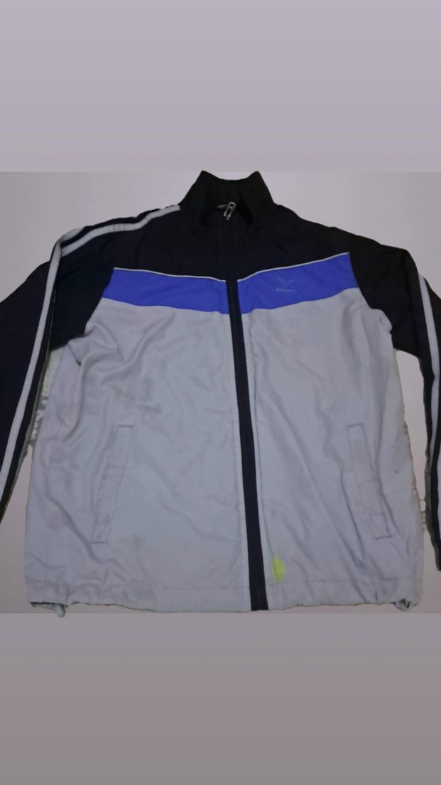 Erkek çocuklar için yüksek yakalı, fermuarlı ön kısmı olan, yumuşak ve sıcak kumaştan yapılmış, gri ve mavi renkli, dar kesimli ceket. Rahat sokak stili için uygundur.