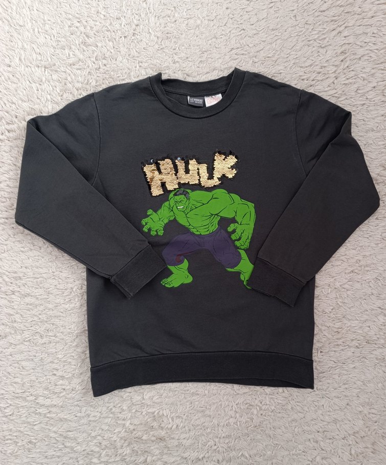 Erkek çocuk için uzun kollu, bisiklet yaka ve bol kesim gri renkli, örme kumaştan yapılmış Hulk baskılı sweatshirt.