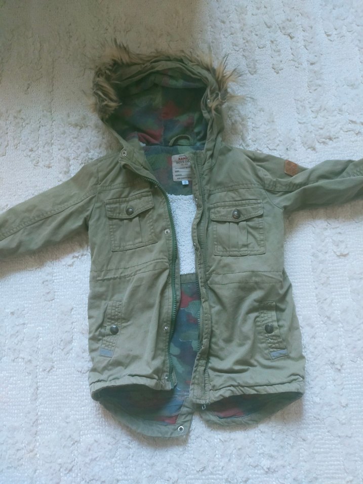 Erkek çocuklar için kamuflaj desenli, kürklü kapüşonlu, bol kesim asker yeşili mont. İçi yumuşak ve sıcak fleece kumaşla kaplıdır. defosuz ve temizdir