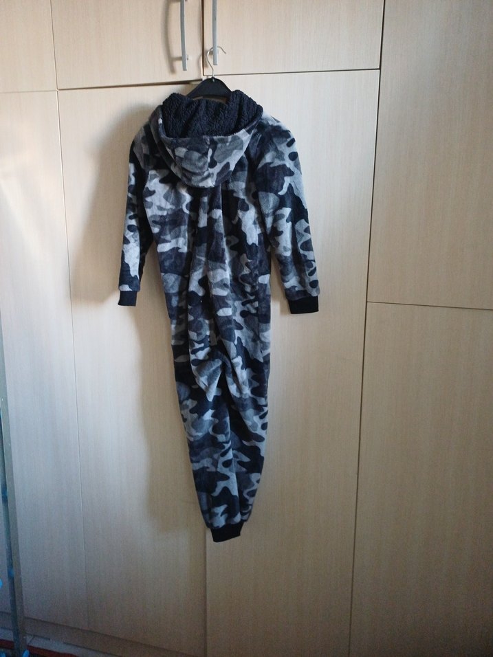 Erkek çocuklar için gri kamuflaj desenli, kapüşonlu, yumuşak ve sıcak kumaştan tulum 9 yaşa uygundur