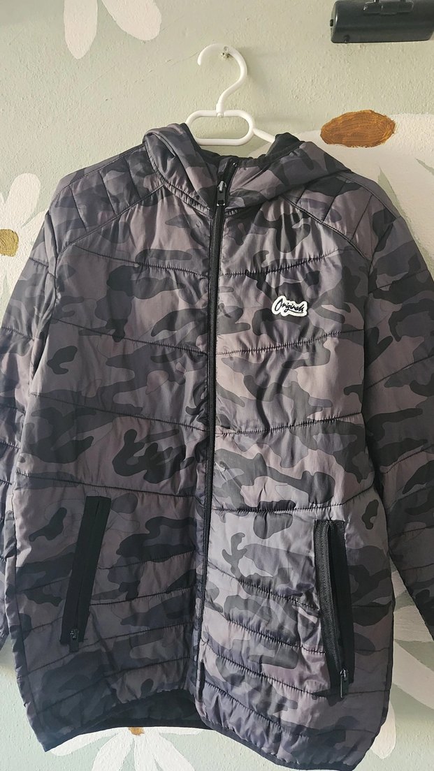 Gri kamuflaj desenli, fermuarlı cepleri ve gevşek kesimi olan erkek çocuk montu. Yumuşak polar kumaştan ve notalı yaka detaylıdır. Ve yep yeni küçük geldiği için satıyorum