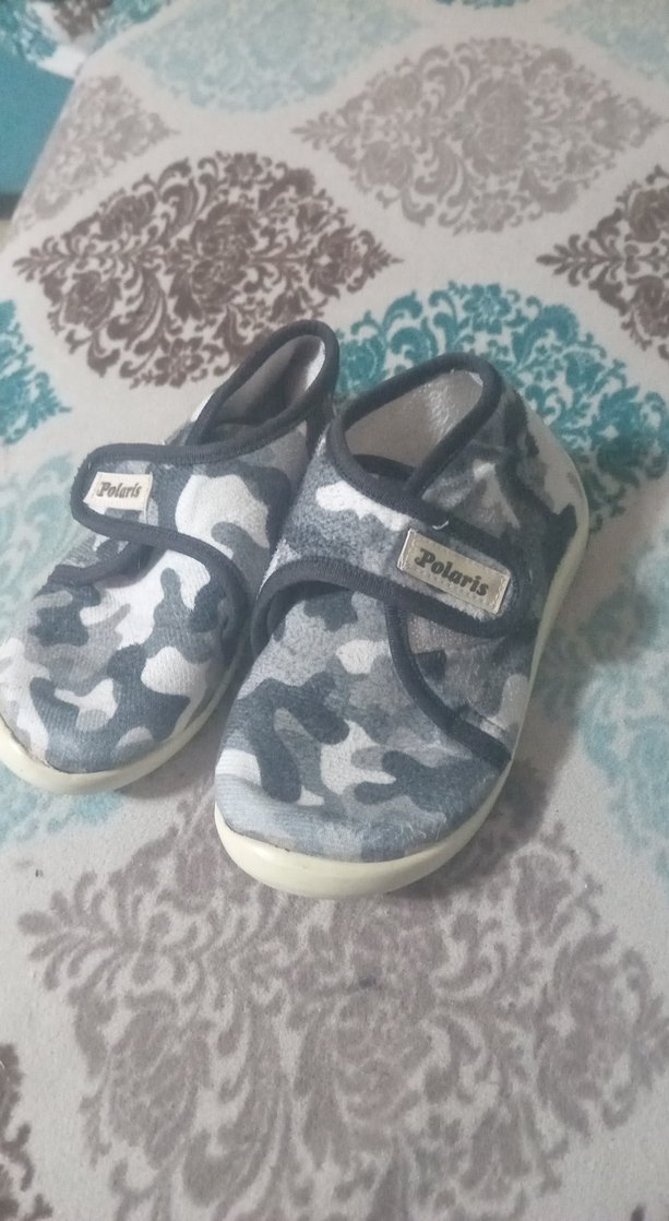 Gri kamuflaj desenli, yumuşak kumaştan erkek çocuk terliği. Ayarlanabilir cırt cırtlı bant ve rahat kullanım sunar.
