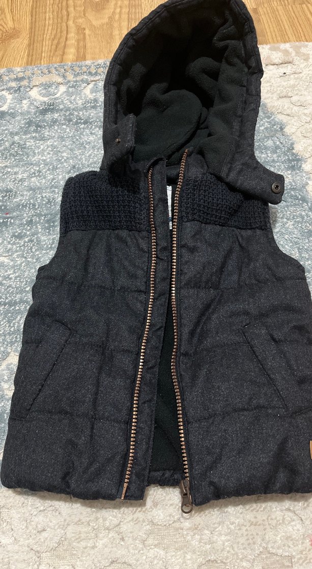 Gri denimden yapılmış, kapüşonlu ve fermuarlı, yüksek yakalı erkek çocuk yeleği. Sokak stiline uygun, dar kesim ve ceplidir. 12-18 Ay 80-86 cm