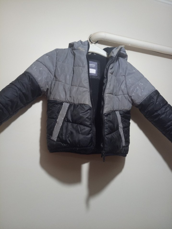 Erkek çocuklar için gri ve siyah panelli, fermuarlı ve yakalı, yumuşak ve sıcak kumaştan üretilmiş, dar kesim sokak stili ceket.