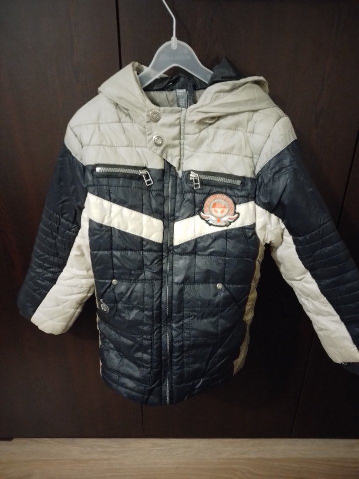 Erkek çocuk için kapüşonlu, fermuarlı ve baskılı desenli, fitted kesim gri siyah mont. Yumuşak ve sıcak kumaştan üretilmiştir, tek kol kısmında deforme vardır, resimde bellidir.