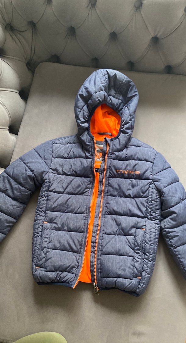 Fermuarlı önü, kesimli yakası ve turuncu iç astarıyla gri, rahat kesim erkek çocuk montu. Sokak stili için uygun, yumuşak ve sıcak kumaş.