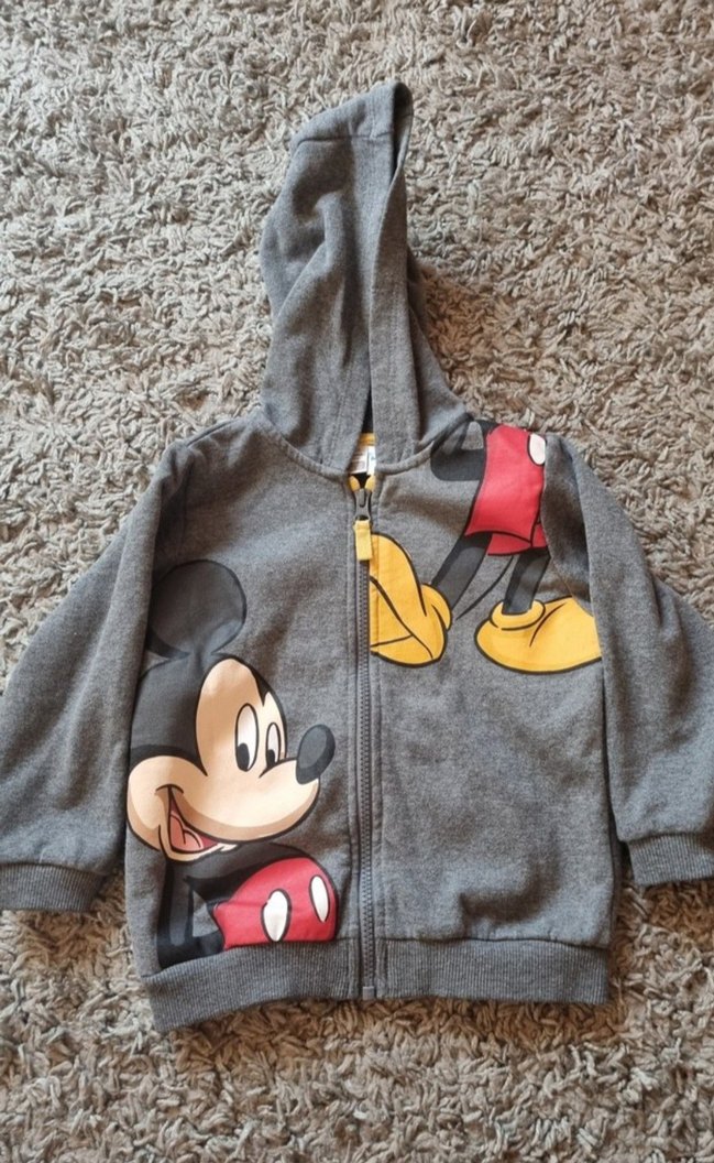 Erkek çocuk için kapüşonlu ve fermuarlı, bol kesim gri sweatshirt. Mickey Mouse baskılı, yumuşak kumaştan yapılmıştır.