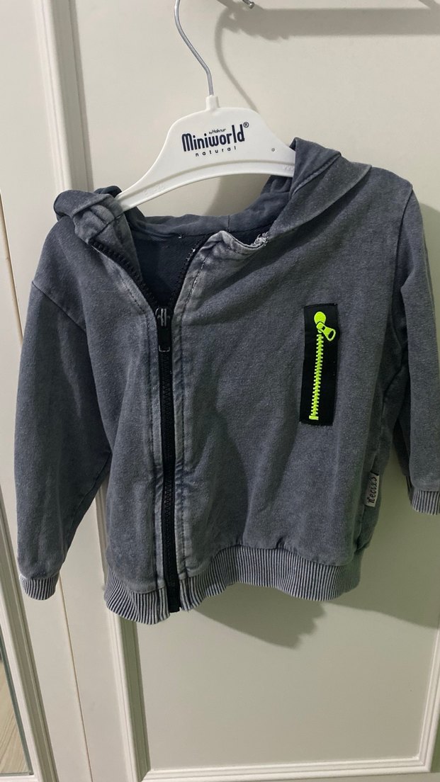 Erkek çocuk için kapüşonlu, uzun kollu ve fermuarlı gri denim sweatshirt. Rahat ve bol kesim, sade sokak stili için uygundur. Miniworld markalı.