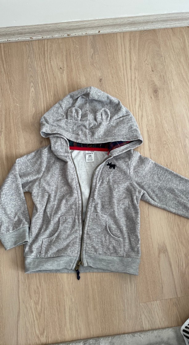 Erkek çocuk için gri, kapüşonlu ve fermuarlı sweatshirt. Uzun kollu, yumuşak ve sıcak kumaştan, rahat ve şık bir sokak stili ürünü.