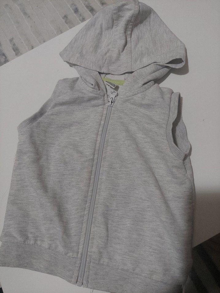 Erkek çocuklar için gri, kapüşonlu ve fermuarlı yelek. Yüksek yakalı, kolsuz ve vücuda oturan kesime sahip, yumuşak ve sıcak kumaştan üretilmiştir.
