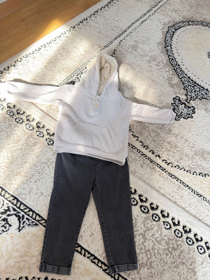 Erkek çocuklar için bol kesim, gri denim kumaştan, kapüşonunda yumuşak kürk detaylı uzun kollu sweatshirt. Desensiz sade tasarım.