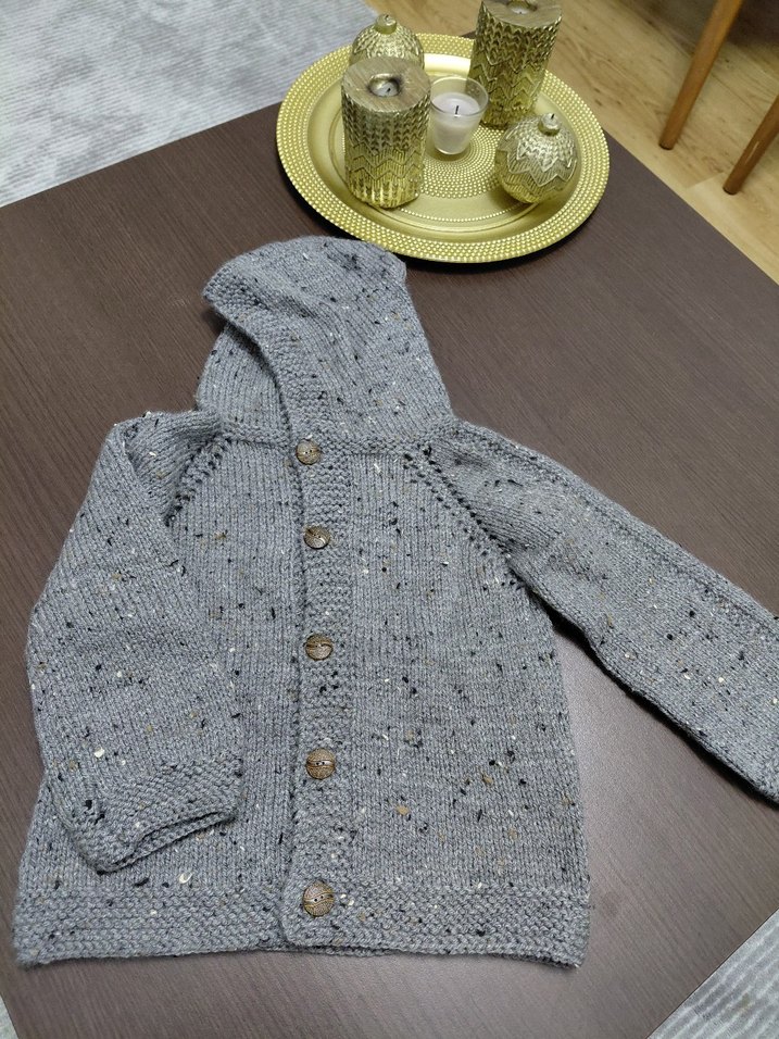 Erkek çocuk için gri renkte, kapüşonlu, düğmeli ve uzun kollu örgü hırka. Rahat ve bol kesimdir.