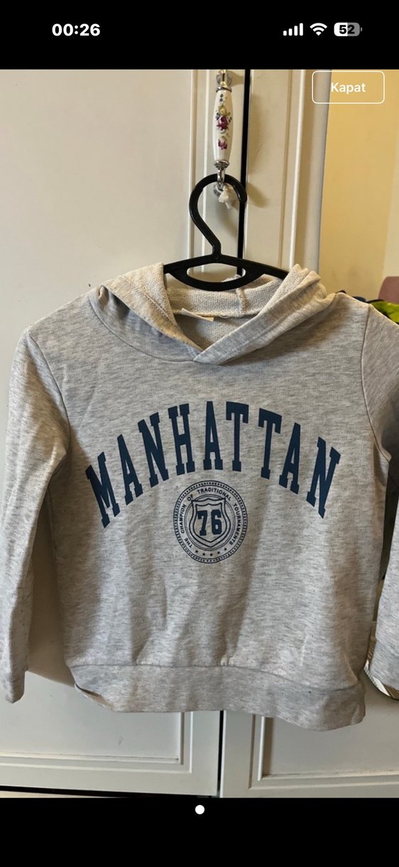 Erkek çocuk için uzun kollu, bisiklet yaka ve baskılı 'MANHATTAN' yazılı gri kapüşonlu sweatshirt. Örme sentetik kumaştan, trend rahat tarz için uygundur.