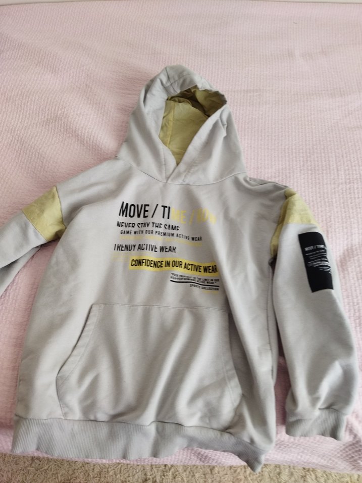Gri kapüşonlu sweatshirt, uzun kollu ve bol kesimdir. Baskılı detaylar ve cırt cırtlı eklerle tamamlanmıştır. Yumuşak ve sıcak kumaştan üretilmiştir.