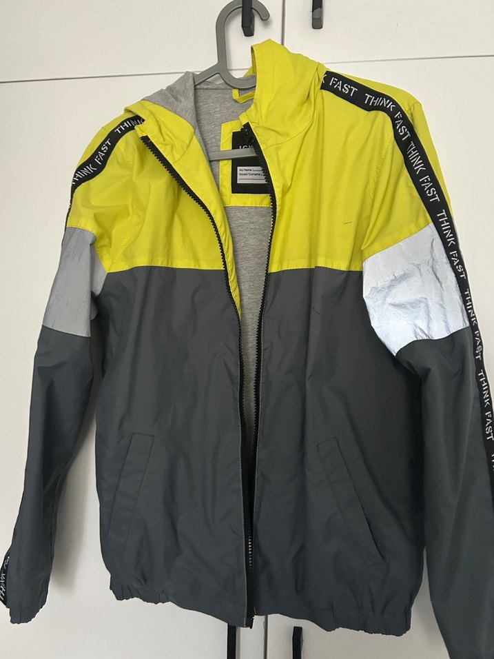 Fermuarlı, yüksek yakalı, sarı ve gri renk bloklu baskılı detaylı erkek çocuk yağmurluğu. Sentetik kumaştan, trend sokak stiline uygun kesim.bir kaç kez giyildi