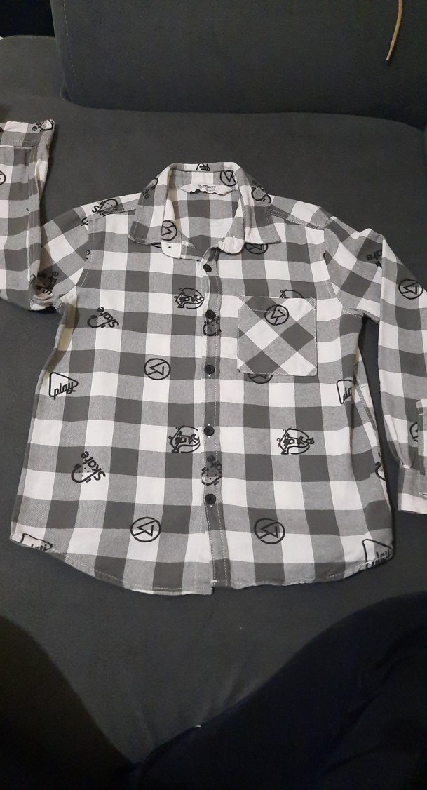 Pamuk kumaştan, gri kareli ve baskılı desenli, düğmeli, uzun kollu, yakalı, bol kesim kışlık erkek çocuk gömleği.