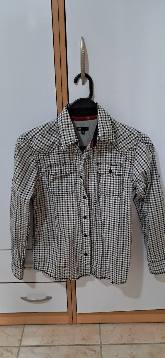 Gri kareli, düğmeli ön ve çentikli yaka detaylı erkek çocuk uzun kollu pamuk gömlek. Rahat kesim, trend sokak stili için uygundur.
