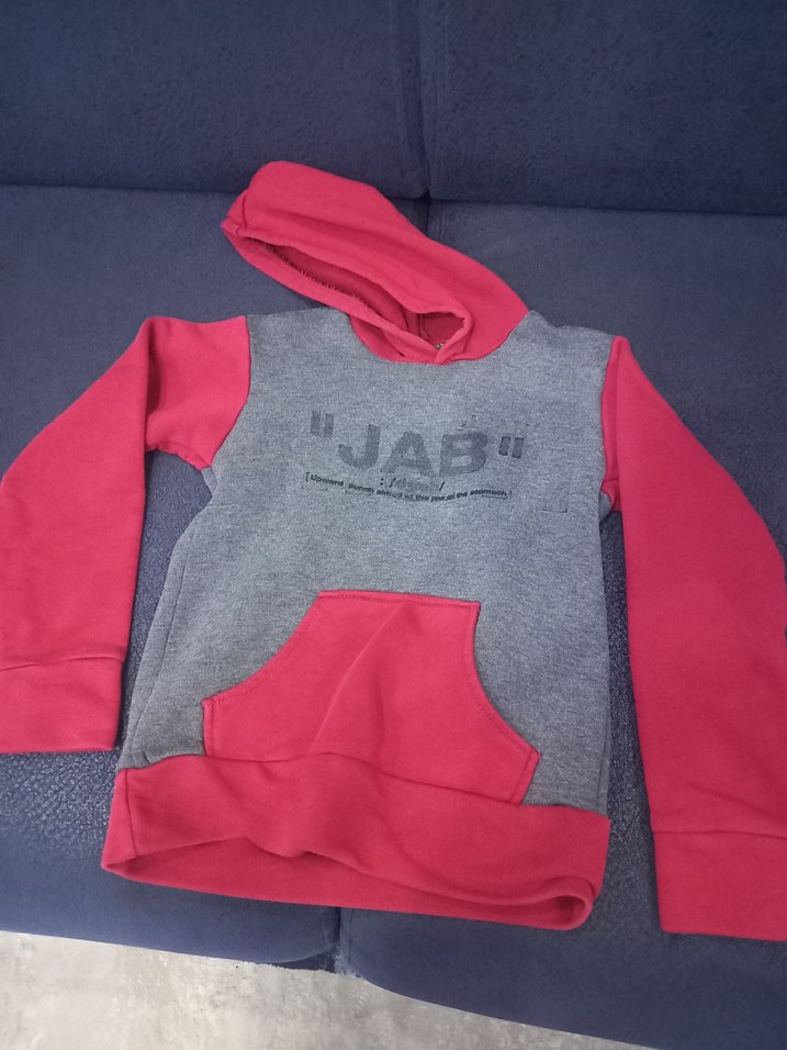 Gri gövde ve kırmızı kollara sahip, "JAB" baskılı, kapüşonlu, uzun kollu ve bol kesim erkek çocuk sweatshirtü. Fermuarlı detay içerir.