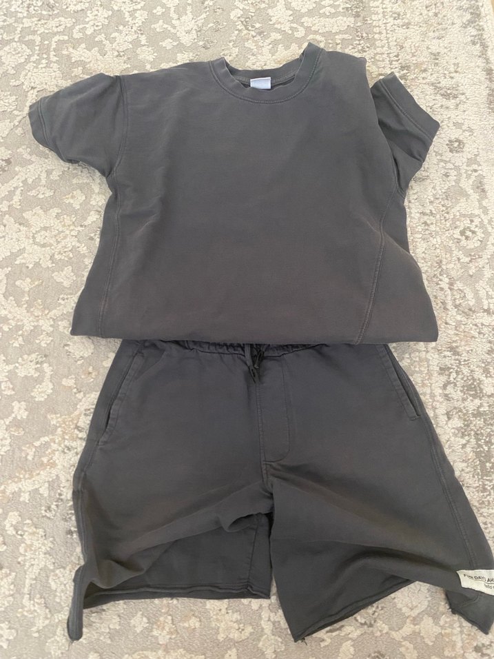 koyu gri, kısa kollu ve yuvarlak yakalı, rahat kesim midi uzunlukta şortlu takım