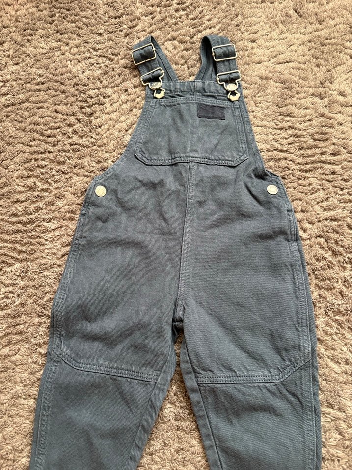 Gri kot kumaştan yapılmış, askılı ve tokalı, bol kesim erkek çocuk tulumu. Ön cep ve yan düğmeler içerir, sokak modasına uygun.birkere doğum gününde giyildi