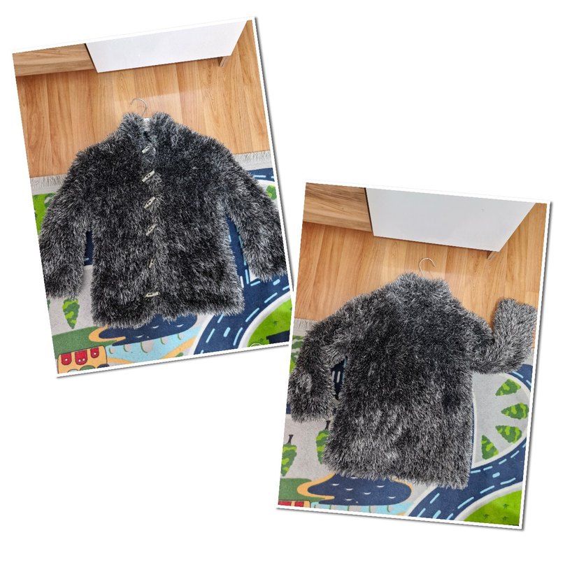 Erkek çocuklar için uzun kollu, gri tie-dye desenli örme kumaştan ve kürk detaylı, vücuda oturan goth tarzında hırka ,mont 5/6 yaşa olur renk siyah gri karışımı