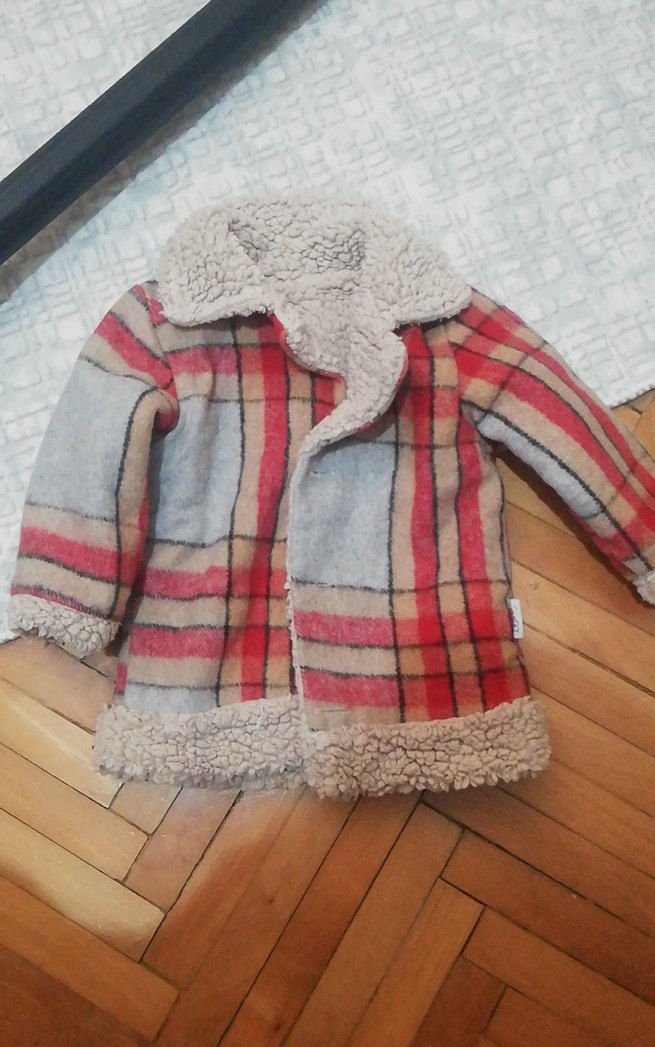 Erkek çocuk için, yakası, manşetleri ve etek ucu kürklü, bol kesim gri ve kırmızı ekose desenli kaban. Yumuşak ve sıcak kumaştan üretilmiştir.