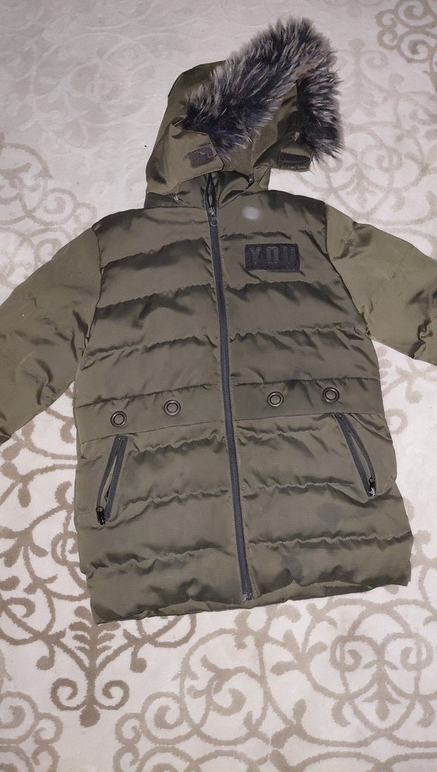 Erkek çocuk için koyu gri, kürklü kapüşonlu, dik kesim streetwear tarzı mont. Fermuarlı cepleri ve yumuşak, sıcak dokusu vardır.