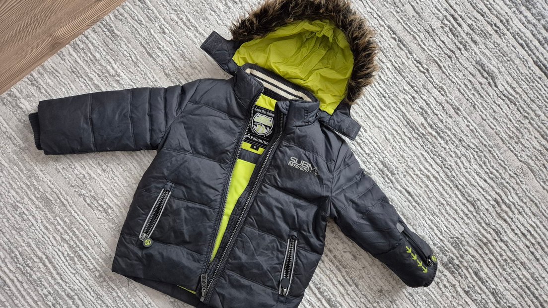Erkek çocuklar için gri, kürklü kapüşonlu, baskılı, yumuşak ve sıcak tutan kumaştan yapılmış, fitted tarzda mont.