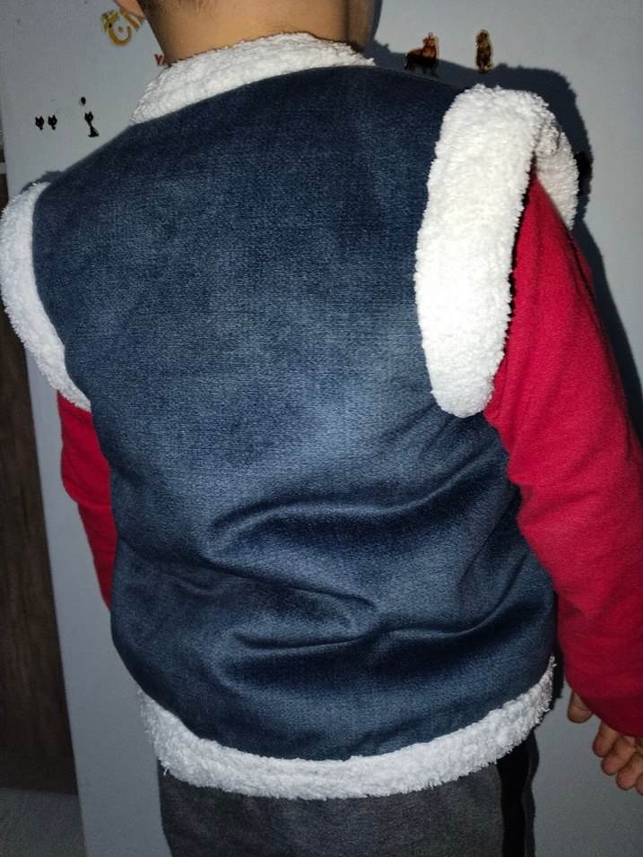 Fitted kesim mavi ve gri tonlarında, yumuşak ve sıcak kumaştan, kürklü detaylı erkek çocuk yeleği. Yuvarlak yakalı ve streetwear tarzında.