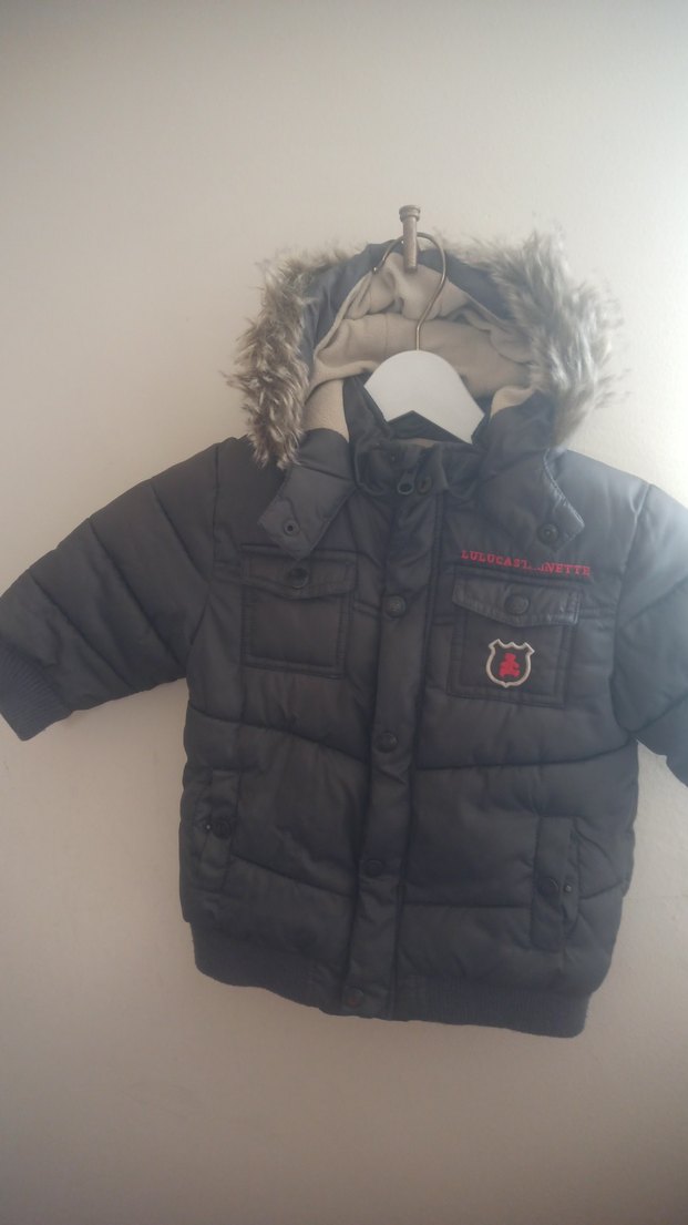 Gri renkli, kürklü kapüşonlu, baskılı ve kesimli erkek çocuk montu. Yumuşak ve sıcak dokuda, sokak tarzına uygun bir model.
