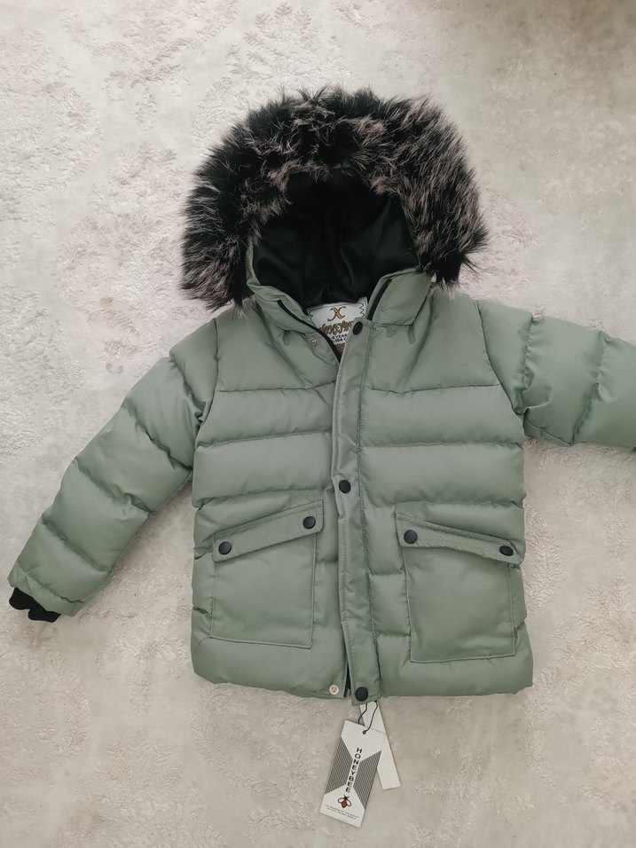 Erkek çocuklar için, gri renkte, kürklü kapüşonlu, yumuşak ve sıcak kumaştan, notched lapel yakalı, düz desenli, fitted kesim sokak stili mont.